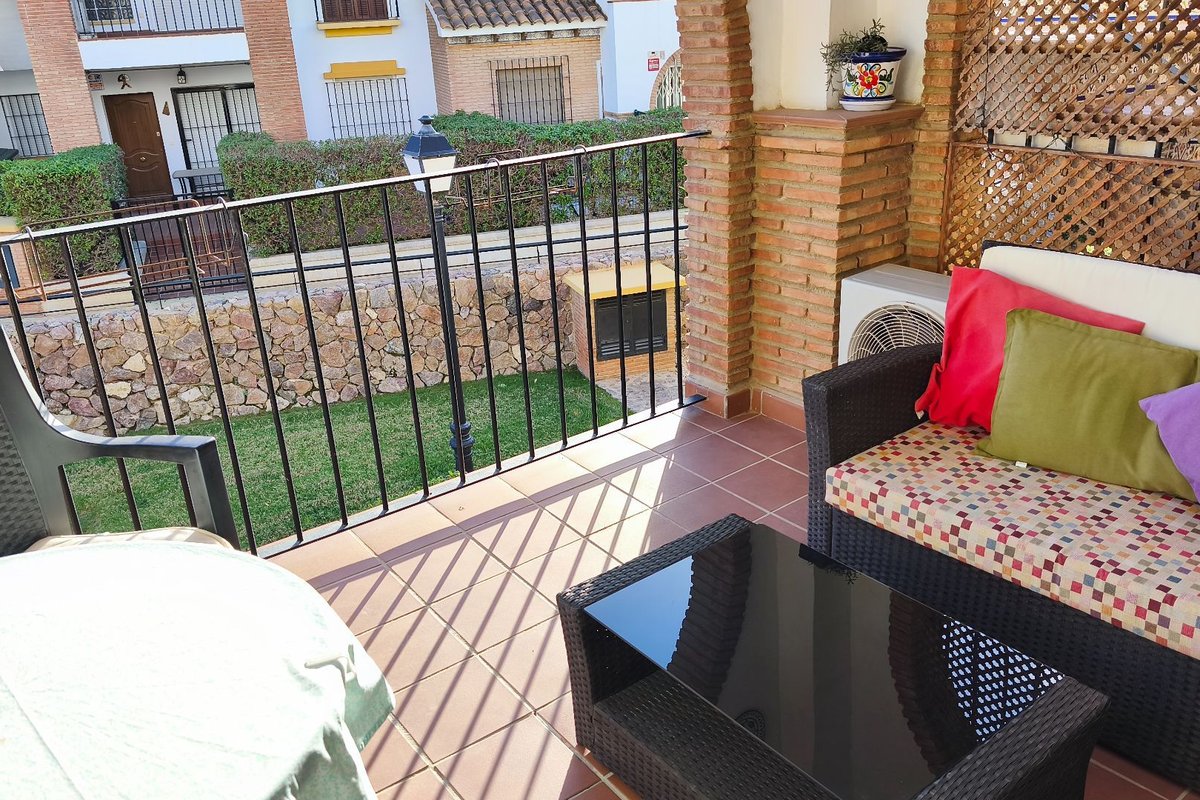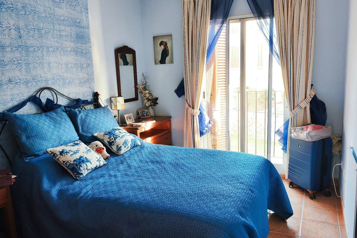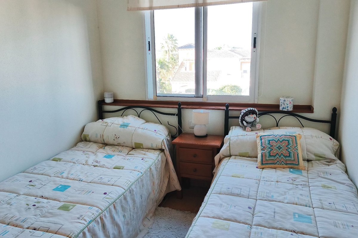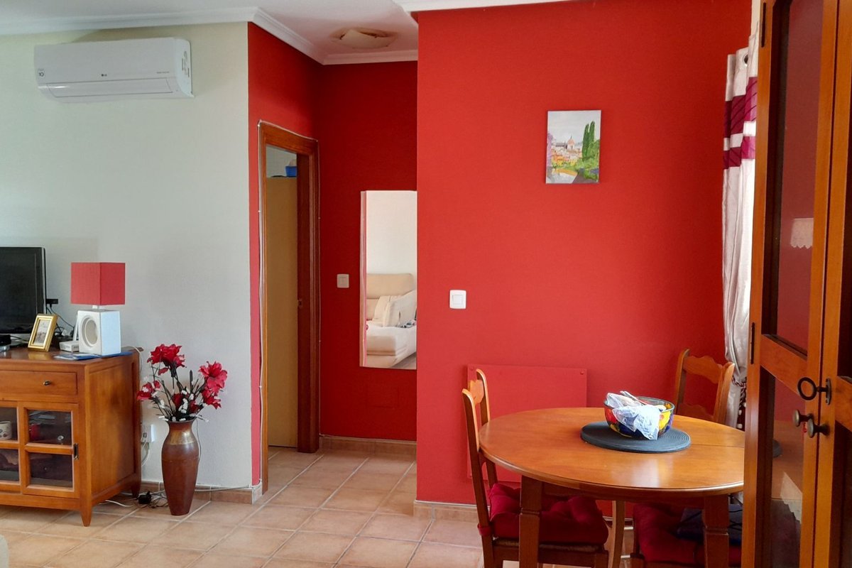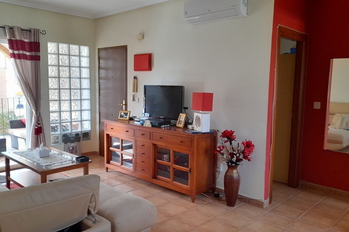 The property features a bright living area with air conditioning, which opens onto a private terrace overlooking the immaculate communal gardens—a perfect spot to relax or enjoy outdoor dining. The fully fitted kitchen enjoys lovely mountain views, which are also shared by the guest bedroom, creating a bright and peaceful atmosphere.