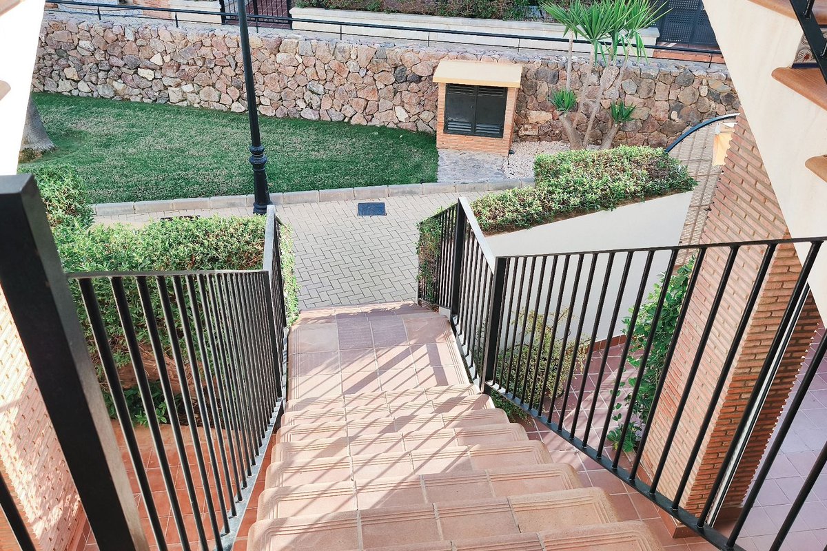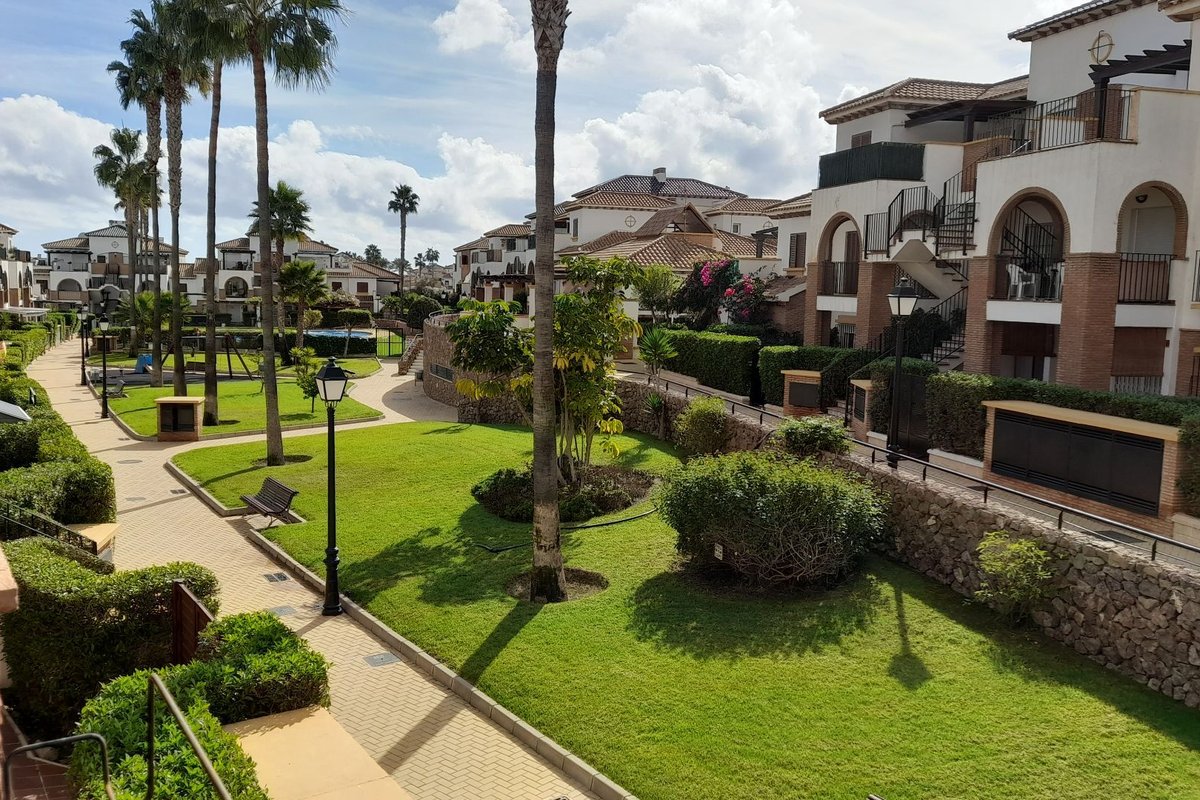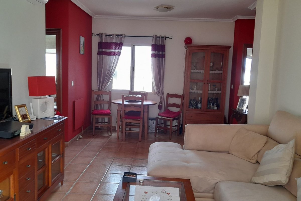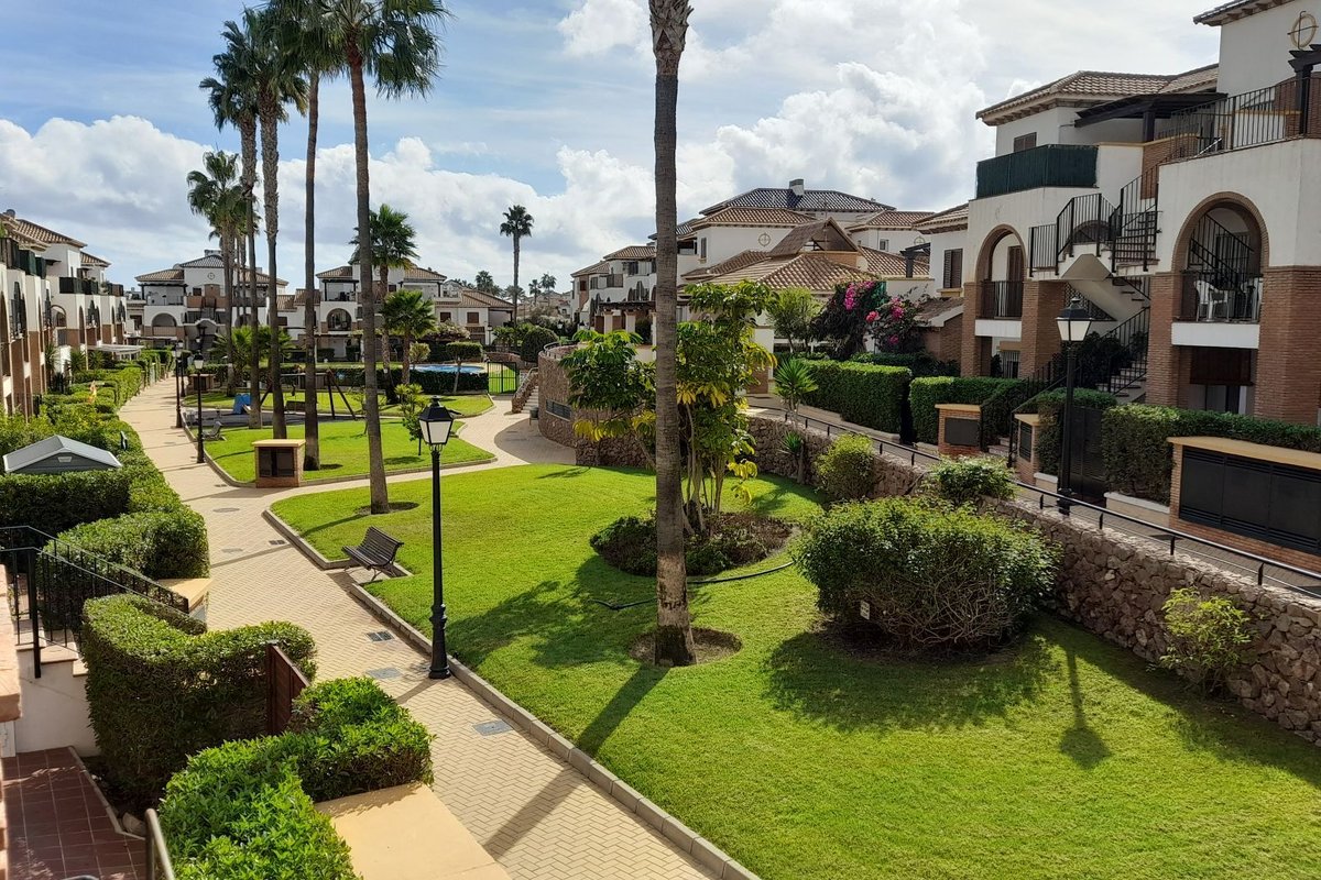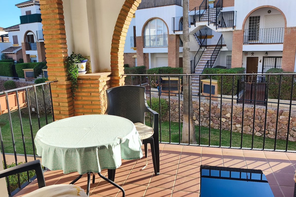 The property features a bright living area with air conditioning, which opens onto a private terrace overlooking the immaculate communal gardens—a perfect spot to relax or enjoy outdoor dining. The fully fitted kitchen enjoys lovely mountain views, which are also shared by the guest bedroom, creating a bright and peaceful atmosphere.