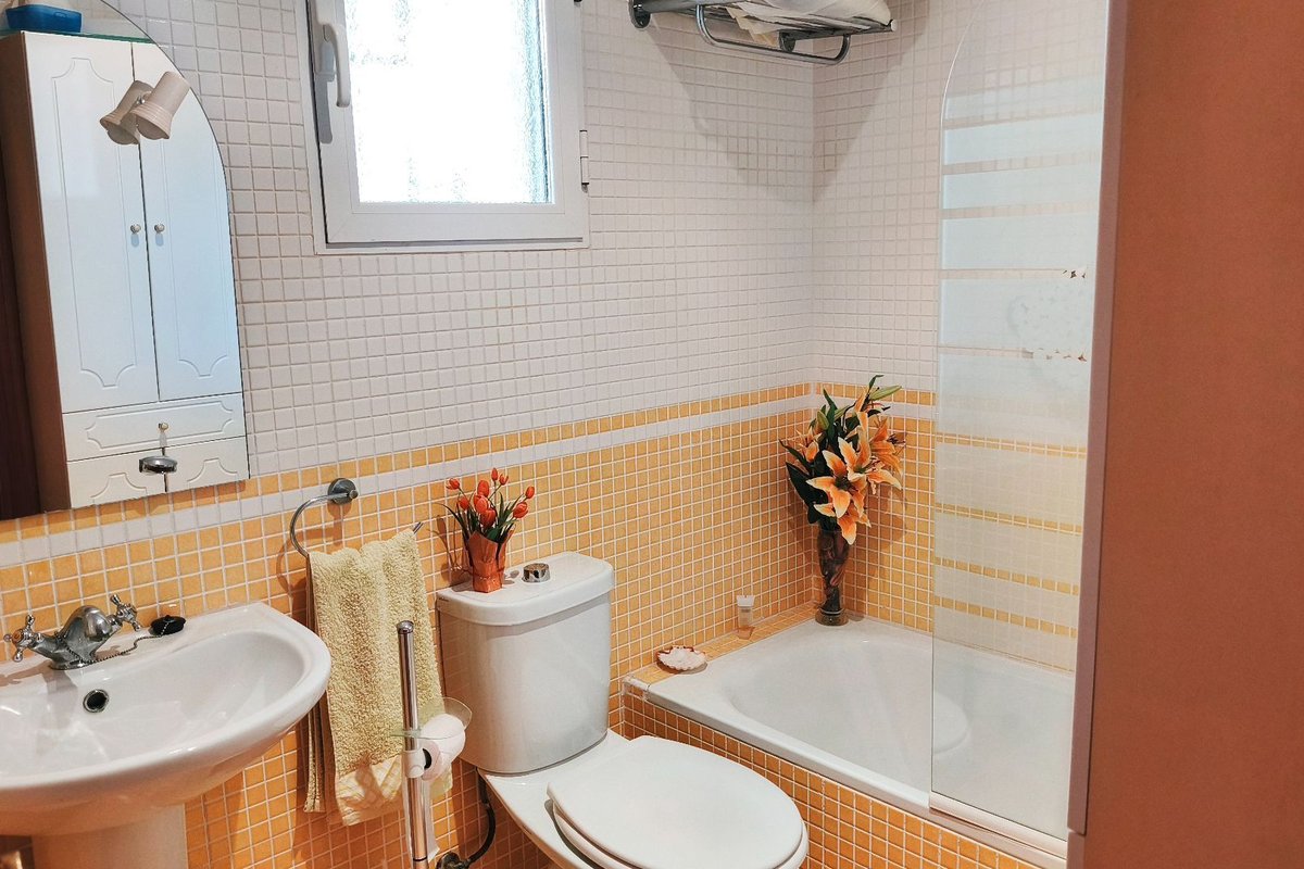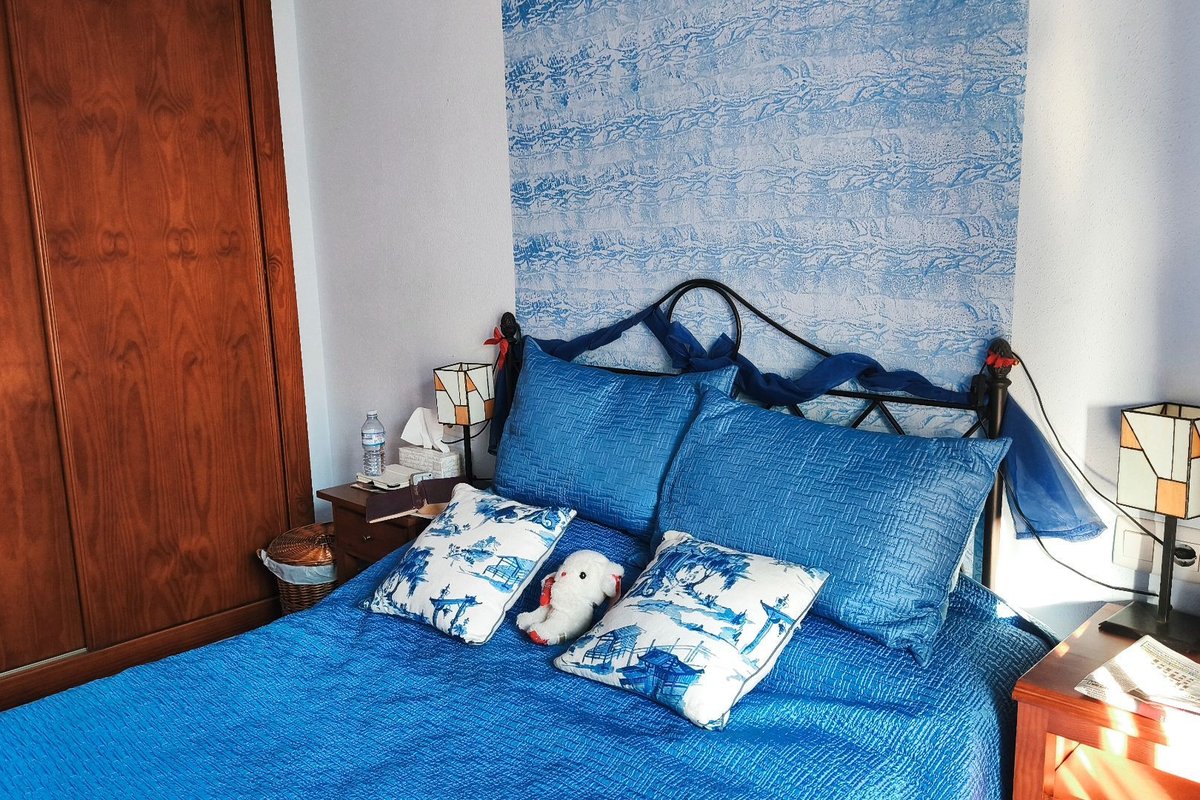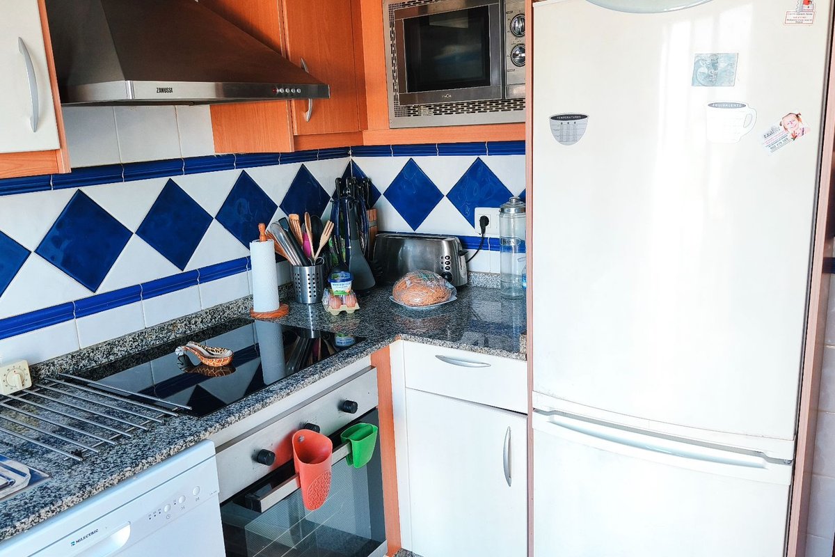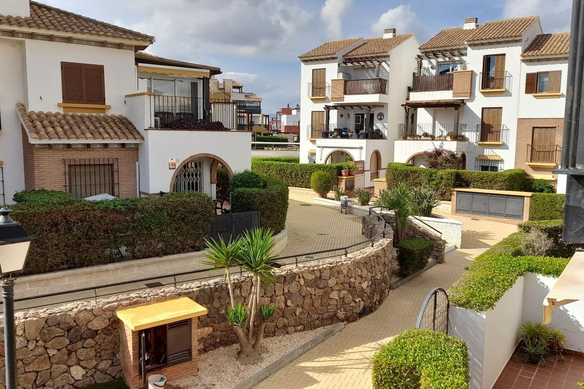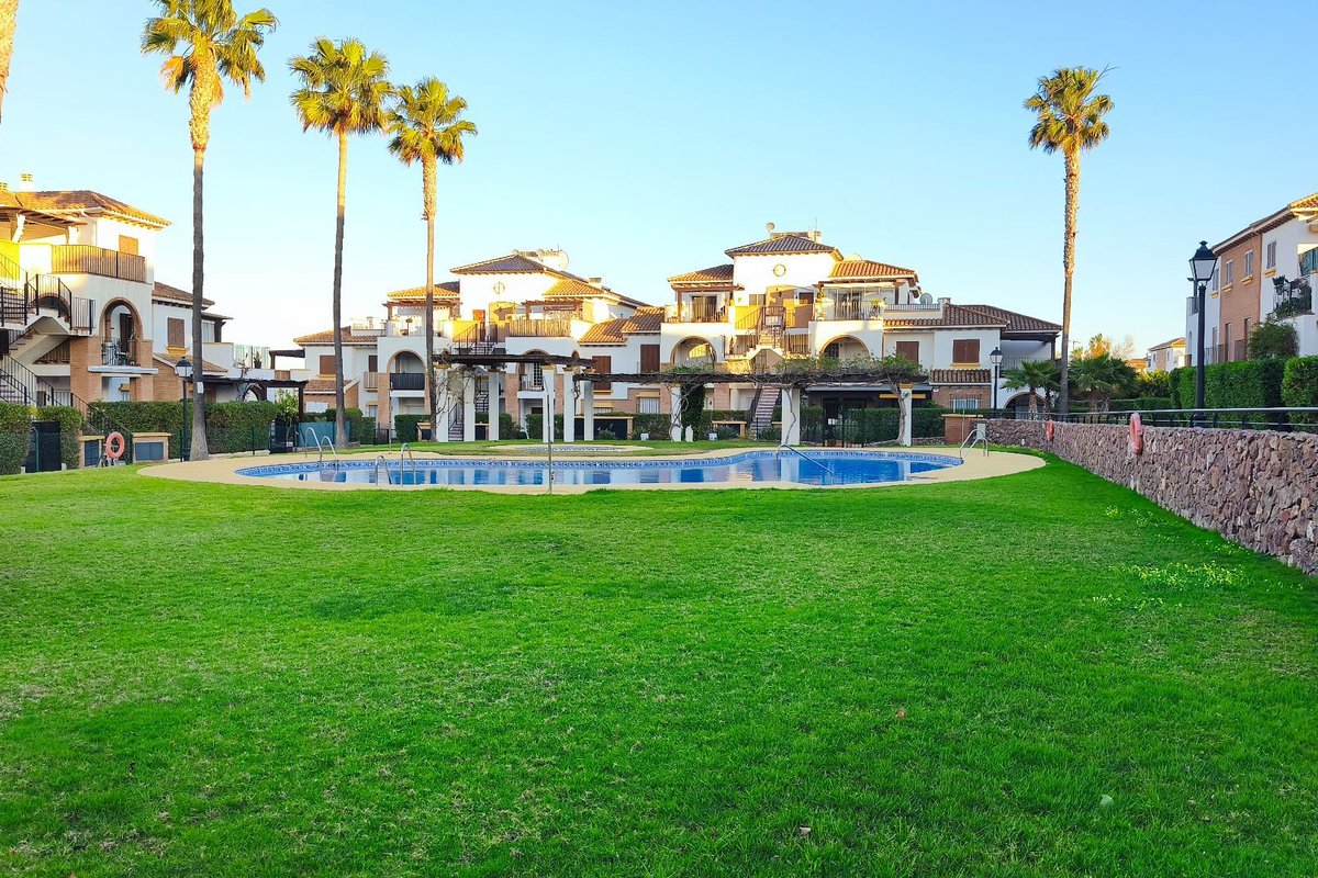 The property features a bright living area with air conditioning, which opens onto a private terrace overlooking the immaculate communal gardens—a perfect spot to relax or enjoy outdoor dining. The fully fitted kitchen enjoys lovely mountain views, which are also shared by the guest bedroom, creating a bright and peaceful atmosphere.