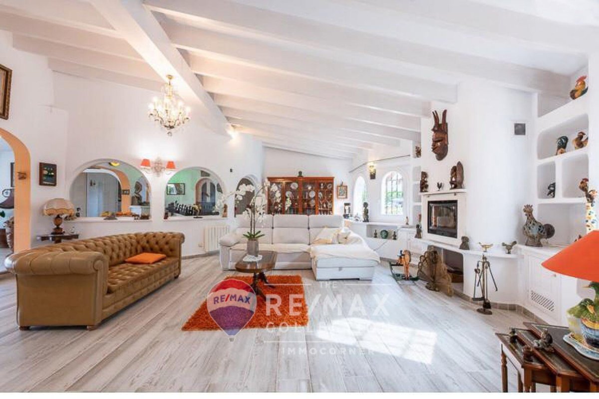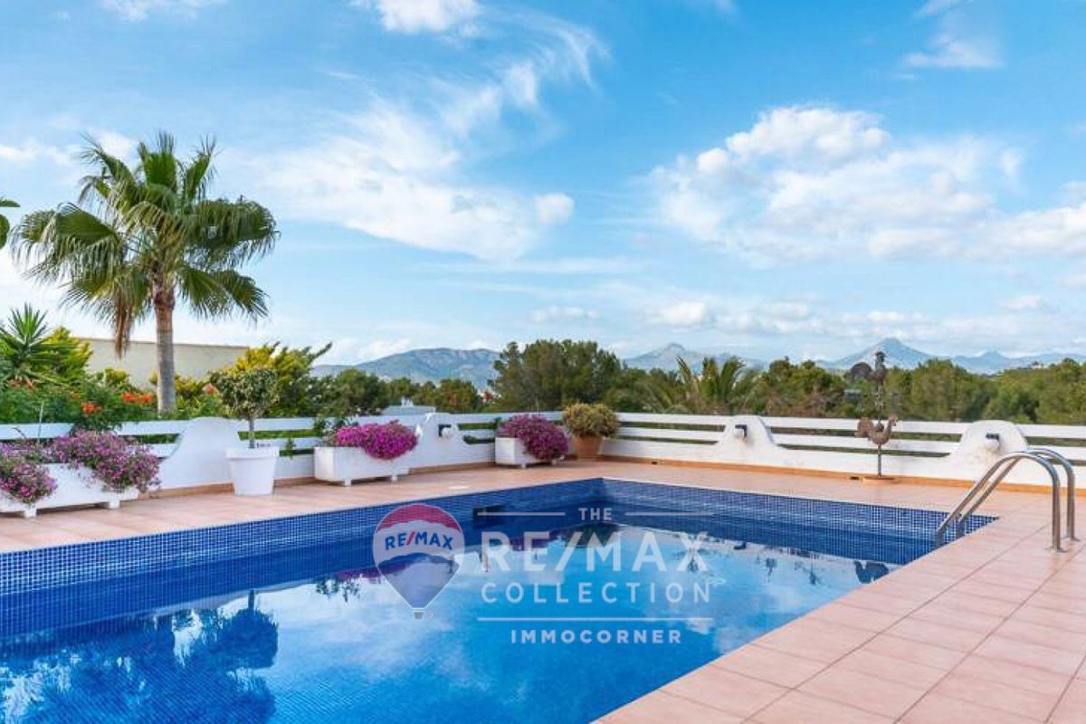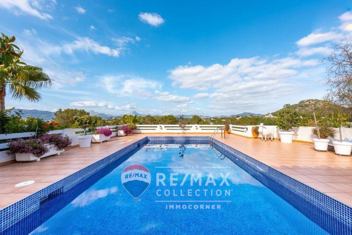 Bright 264m2 villa with garden, terraces with porch and pool in Nova Santa Ponsa. It is on one floor and offers fantastic views of the Sierra de Tramuntana. The main features include: living room with fireplace, spacious dining room with access to the terrace, independent equipped kitchen, 4 bedrooms, 4 bathrooms (3 ensuite) and fitted wardrobes. The property is equipped with air conditioning and garage. It should be noted that there is the possibility of expanding the house by building an additional floor.~