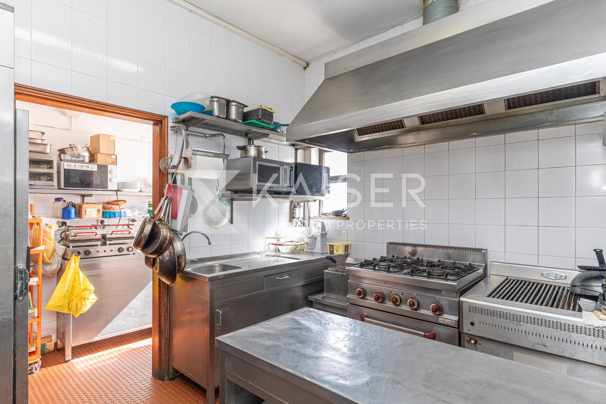 The restaurant comprises a generous bar counter, a fully equipped kitchen and scullery, an indoor seating area, a terrace, 3 toilets (2 for clients, 1 for staff), and has a capacity of 100 pax (40 inside and 60 on the terrace). It operates all year round.