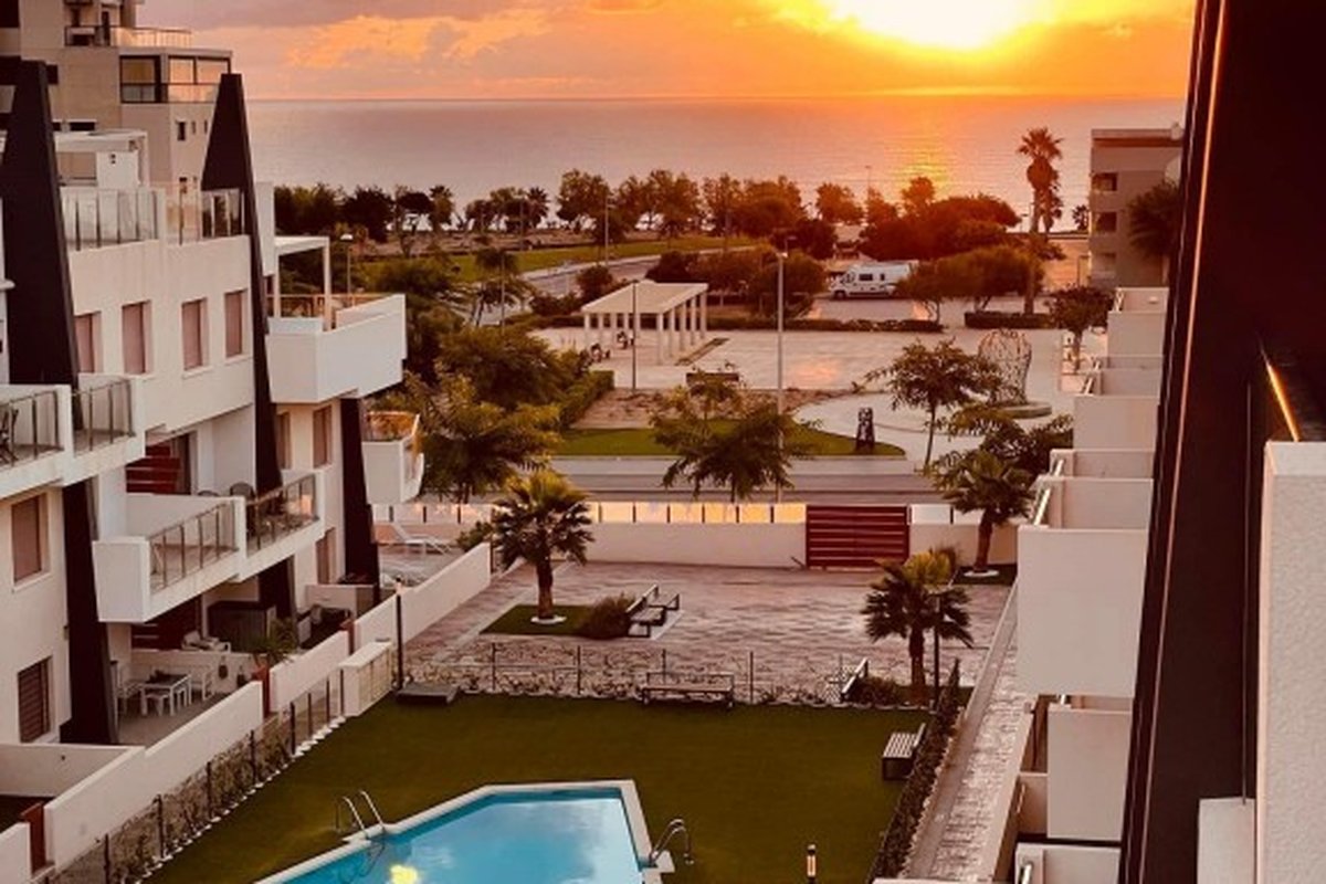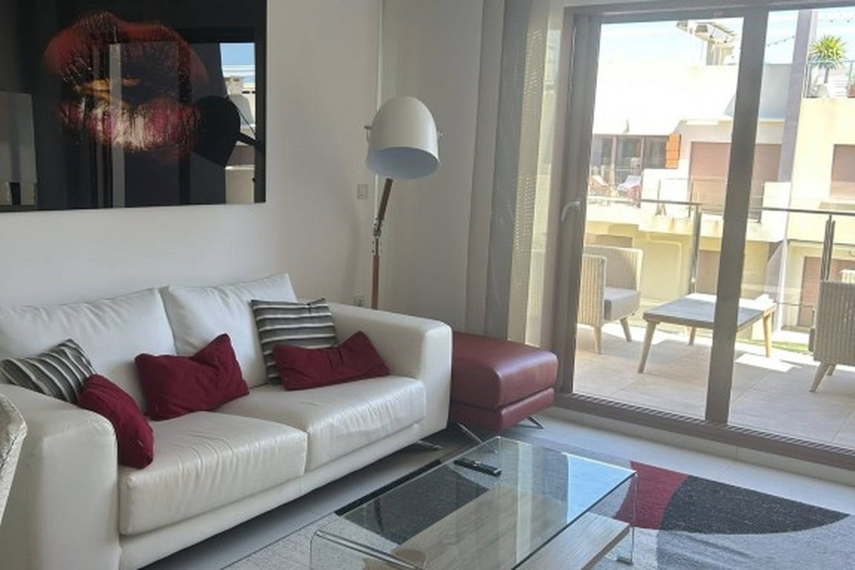 penthouse with ocean view. Discover this stunning penthouse with see view located in the charming town of Torre de la Horadada, just 100 m walk from the beach.This modern penthouse offers a comfortable living area of approximately 70 m², thoughtfully laid out with a bright living room, open kitchen, two spacious bedrooms, and two fully equipped bathrooms. Large windows provide plenty of natural light and a pleasant connection to the outdoors.One of the absolute highlights of this home is the outdoor space. In addition to a cozy terrace off the living room, the penthouse features a spacious private solarium of 70 m². Here you can fully enjoy the Mediterranean climate, with ample space for a lounge, outdoor kitchen, or jacuzzi.The complex offers a well-maintained, gated residence with beautiful green areas, two communal swimming pools, and a child-friendly environment. Thanks to its location just a few minutes’ walk from the beach, restaurants, and shops, this is the ideal place for both personal use and investment.In short, a unique combination of comfort, outdoor space, and a prime location on the Costa Blanca.