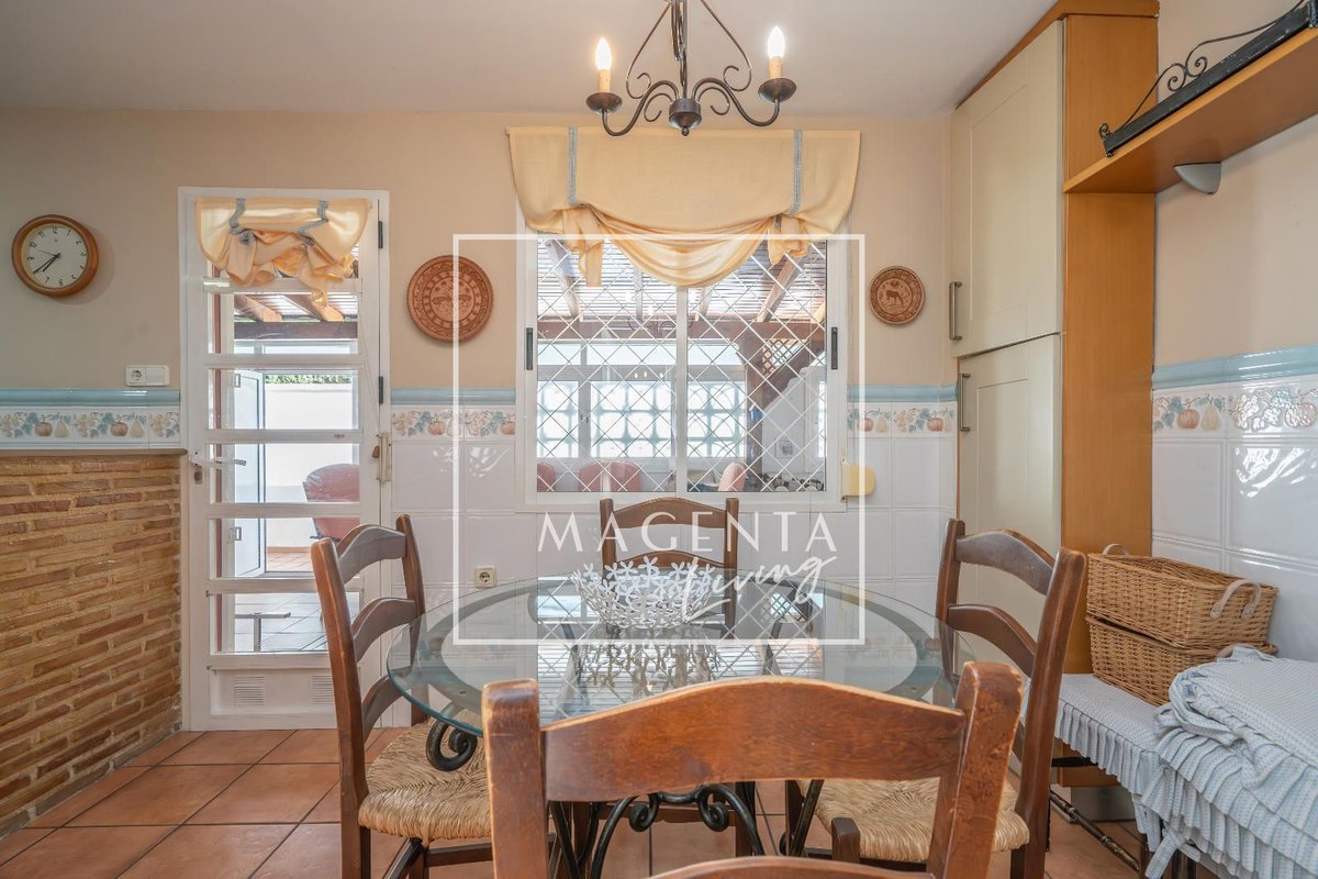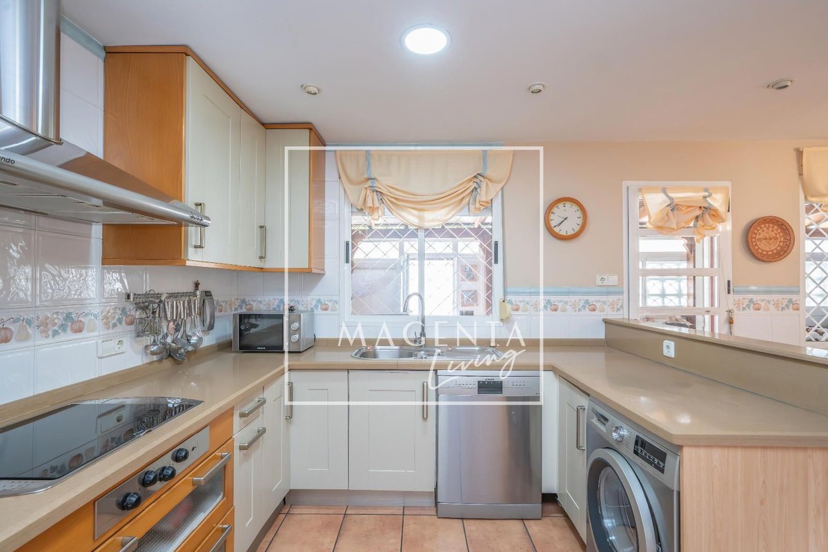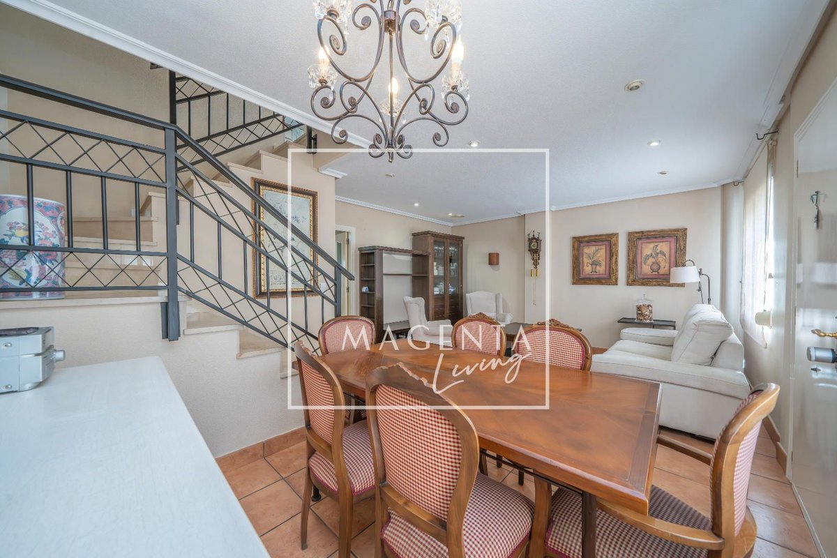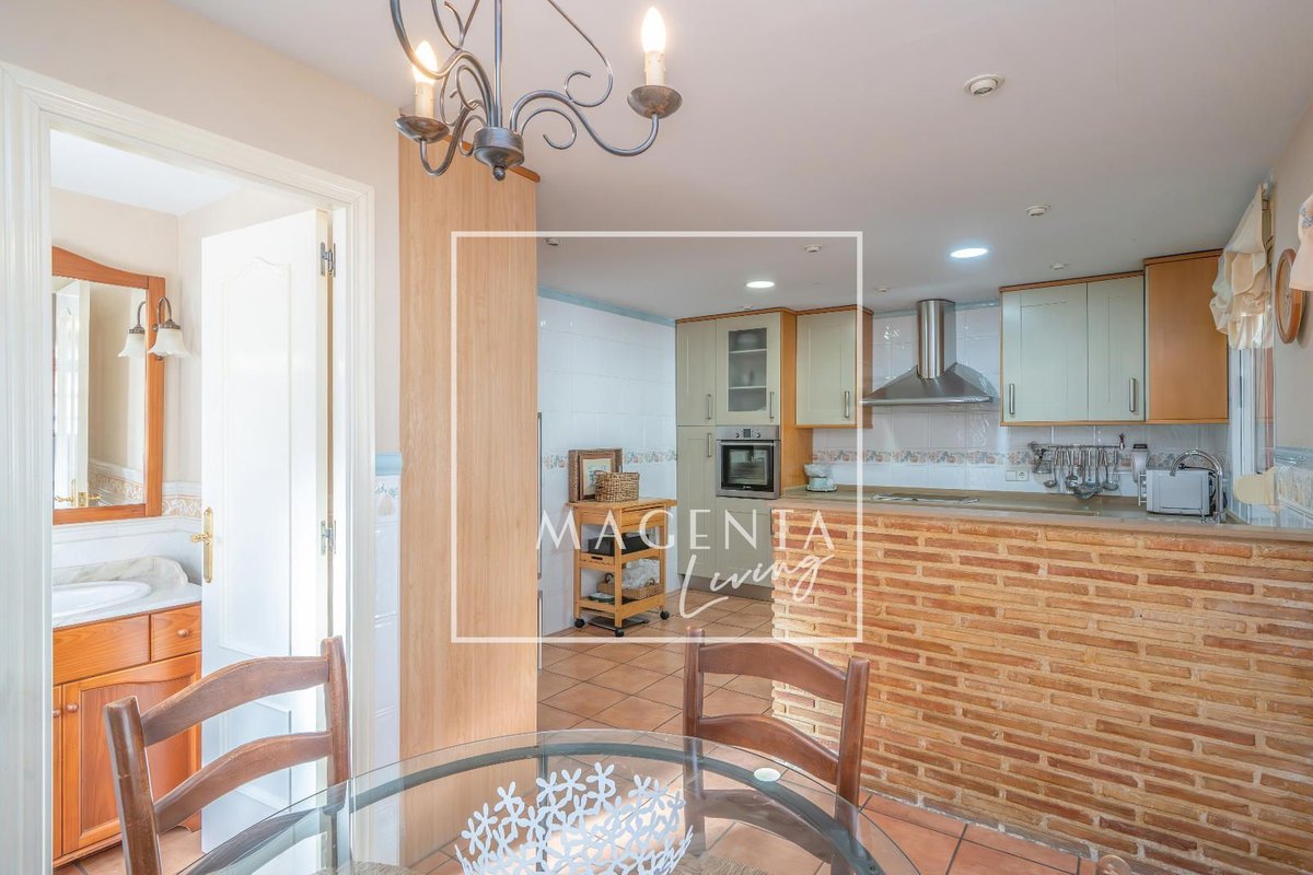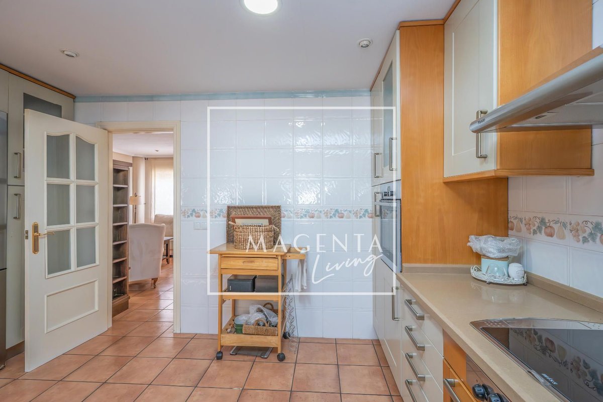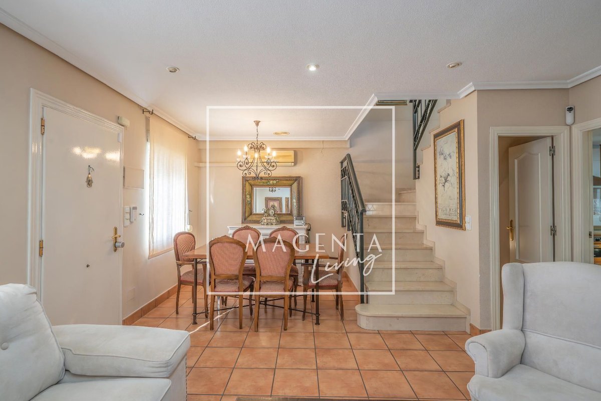 The property is laid out in a functional and welcoming way. On the main floor, there is an elegant living-dining room, perfect for everyday living. Next to the staircase leading to the upper floor, you will find a spacious, fully equipped kitchen with timeless finishes, open to a pleasant breakfast area, as well as a guest toilet. From the kitchen, there is access to a large covered terrace of 33 m², which connects to an additional open terrace of 25 m²—ideal for family gatherings, outdoor dining, or relaxing moments.