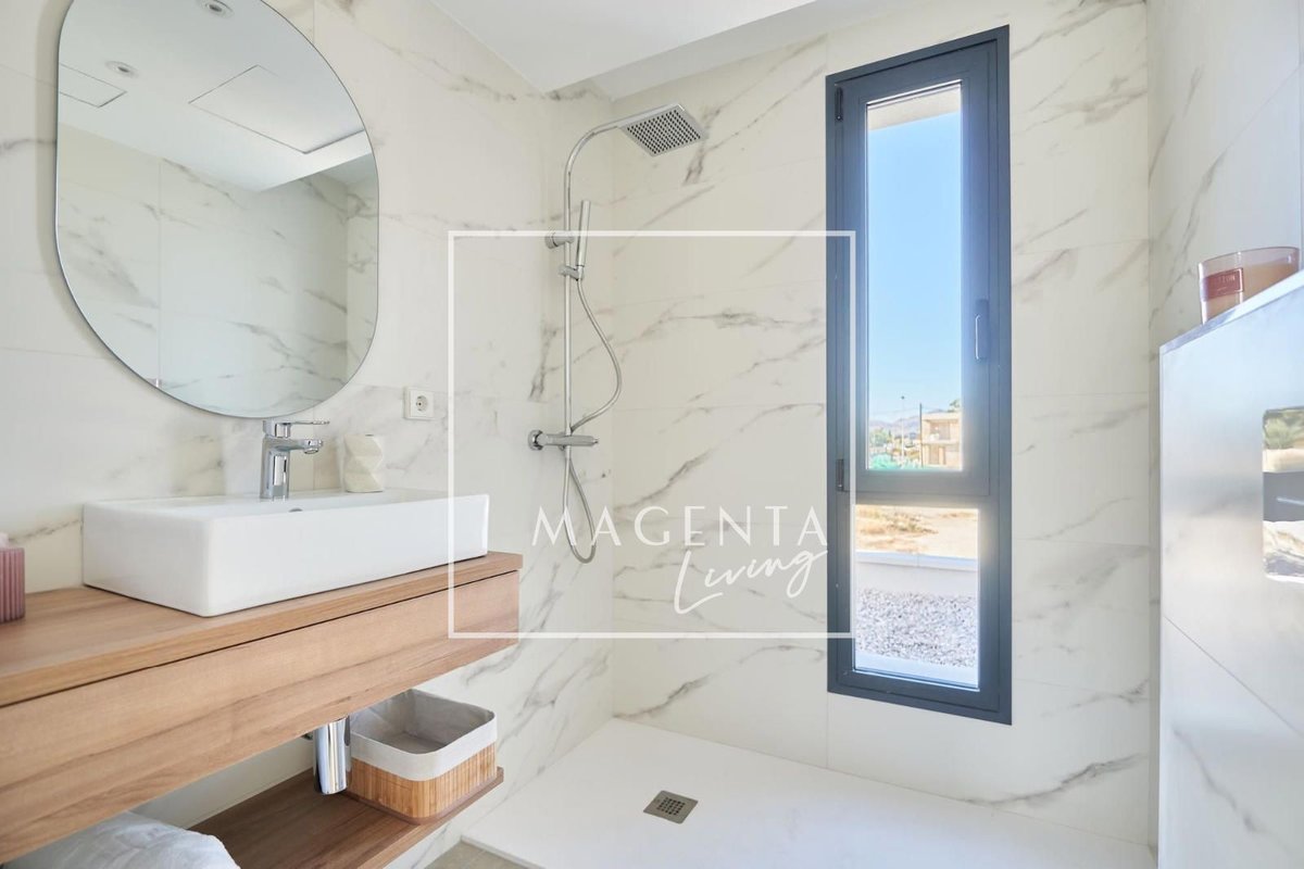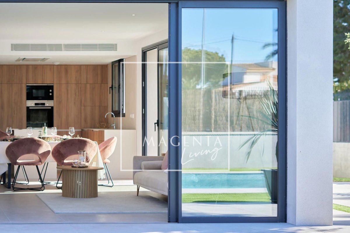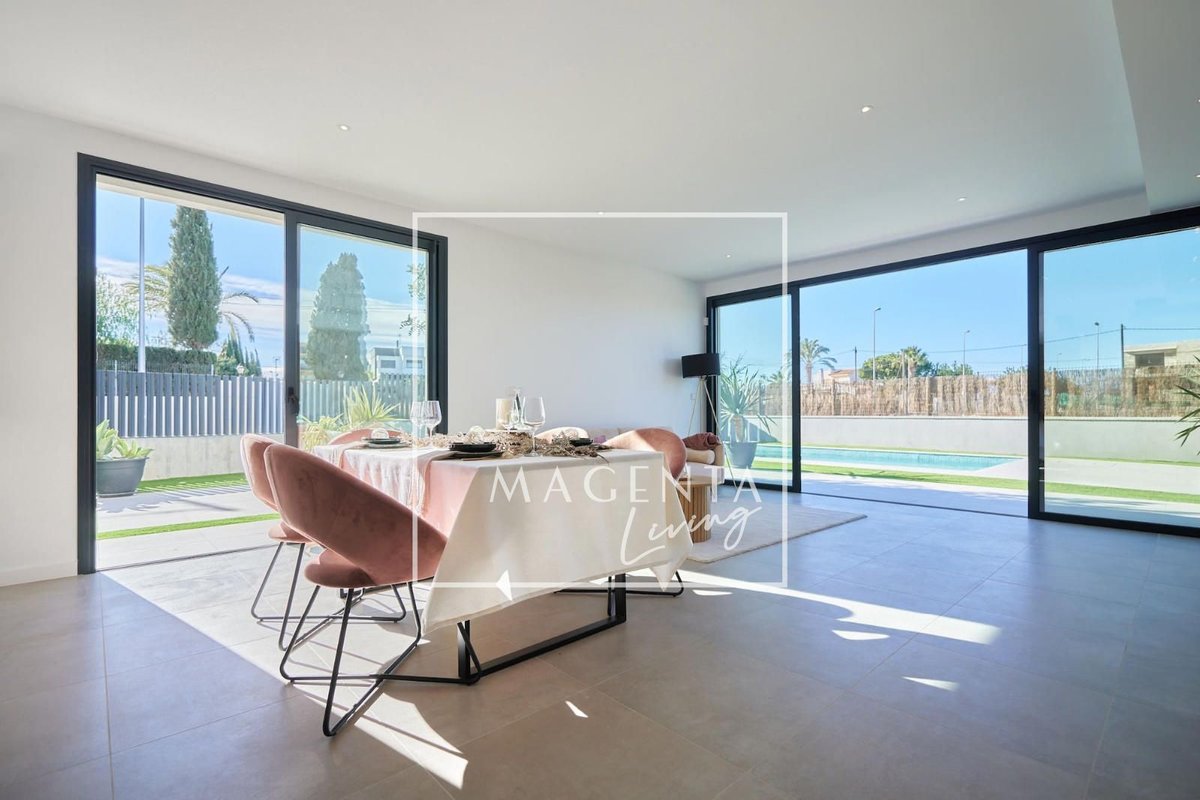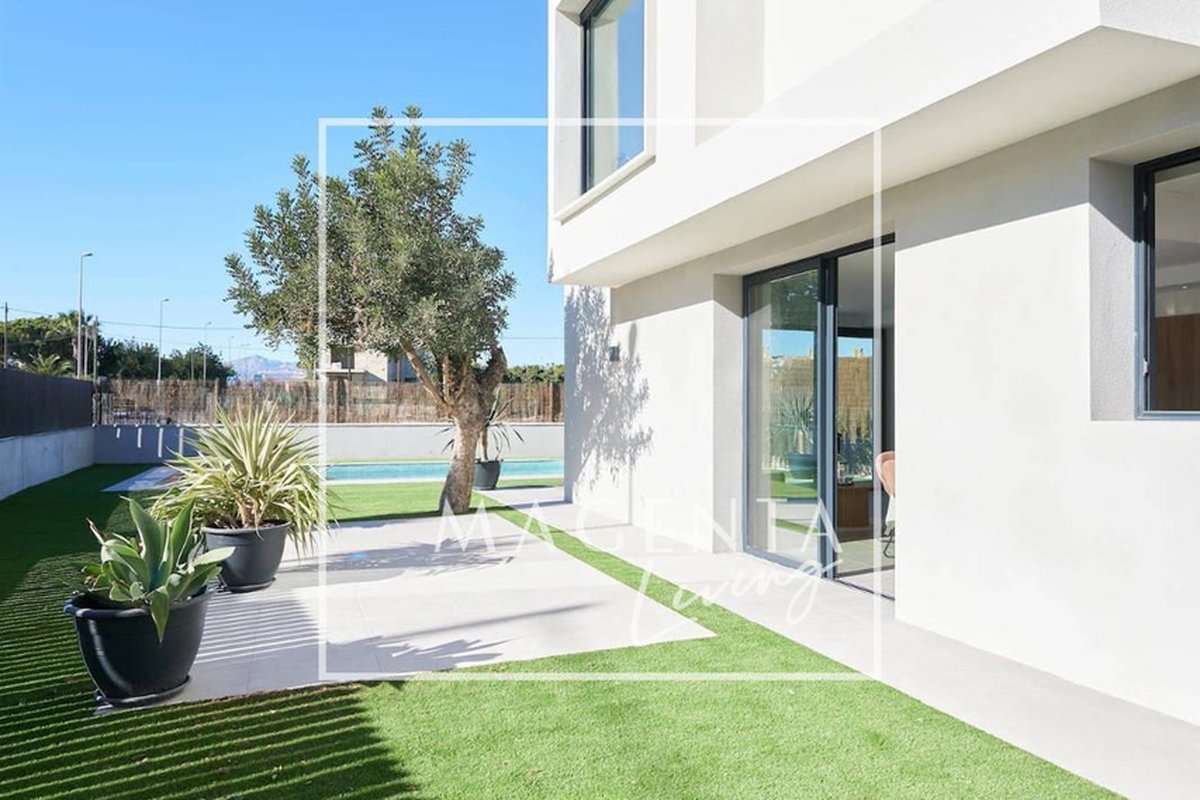 Exclusive detached villa with contemporary design, located in a private residential complex of only 21 homes in the prestigious area of La Font (El Campello). Its excellent location offers residential tranquillity just 2 km from Muchavista Beach, with convenient access to San Juan Playa, San Juan Pueblo and Alicante city centre.Set on a 355 m² plot, the property stands out for its modern architectural design, double-height entrance and a layout planned to maximise natural light and open spaces.On the main floor, the home features a fully equipped open-concept kitchen that blends seamlessly with a spacious living-dining room. Large glass doors lead to a generous terrace that opens onto an ample garden and a private pool, creating an ideal setting for relaxation. This floor also includes a guest toilet.The upper floor houses three bedrooms. The main bedroom, measuring 17 m², includes an en-suite bathroom, built-in wardrobes and a private 6 m² open terrace with clear views of the garden and pool. The two additional bedrooms, each over 9 m², also include built-in wardrobes and share a modern full bathroom.The 34 m² basement offers an open-plan space, a full bathroom and a practical English patio that provides natural light and ventilation, making it an ideal multifunctional area.This home boasts an A energy rating thanks to its individual aerothermal system for hot water, ducted air conditioning (hot/cold), LED lighting, solar panels and pre-installation for an electric vehicle charging point. It also includes two private parking spaces within the plot.La Font is one of the most desirable areas around Alicante due to its proximity to the sea, excellent range of services, international schools and leisure areas—combining comfort and exclusivity in a peaceful, well-connected environment.A modern, bright and energy-efficient home, perfect for those seeking quality, design and a privileged location.Contact us and discover this magnificent villa in La Font, El Campello.