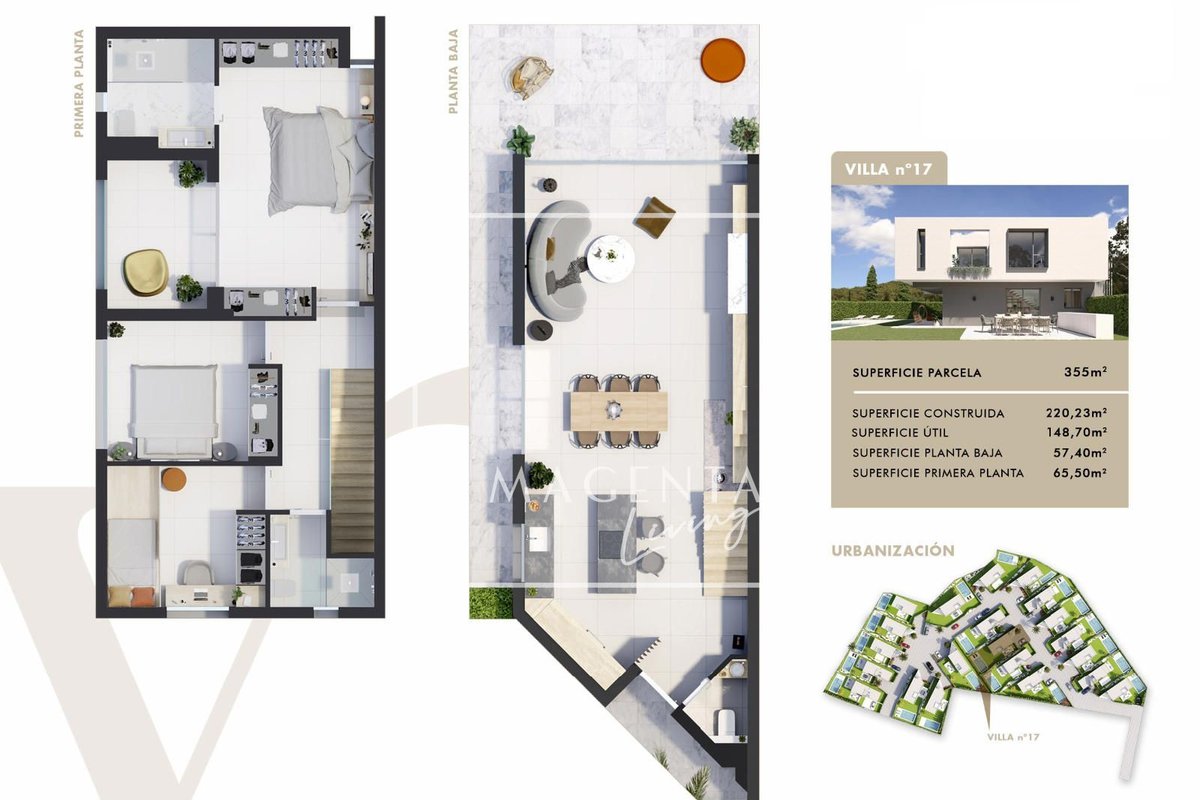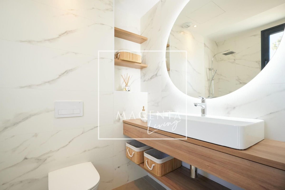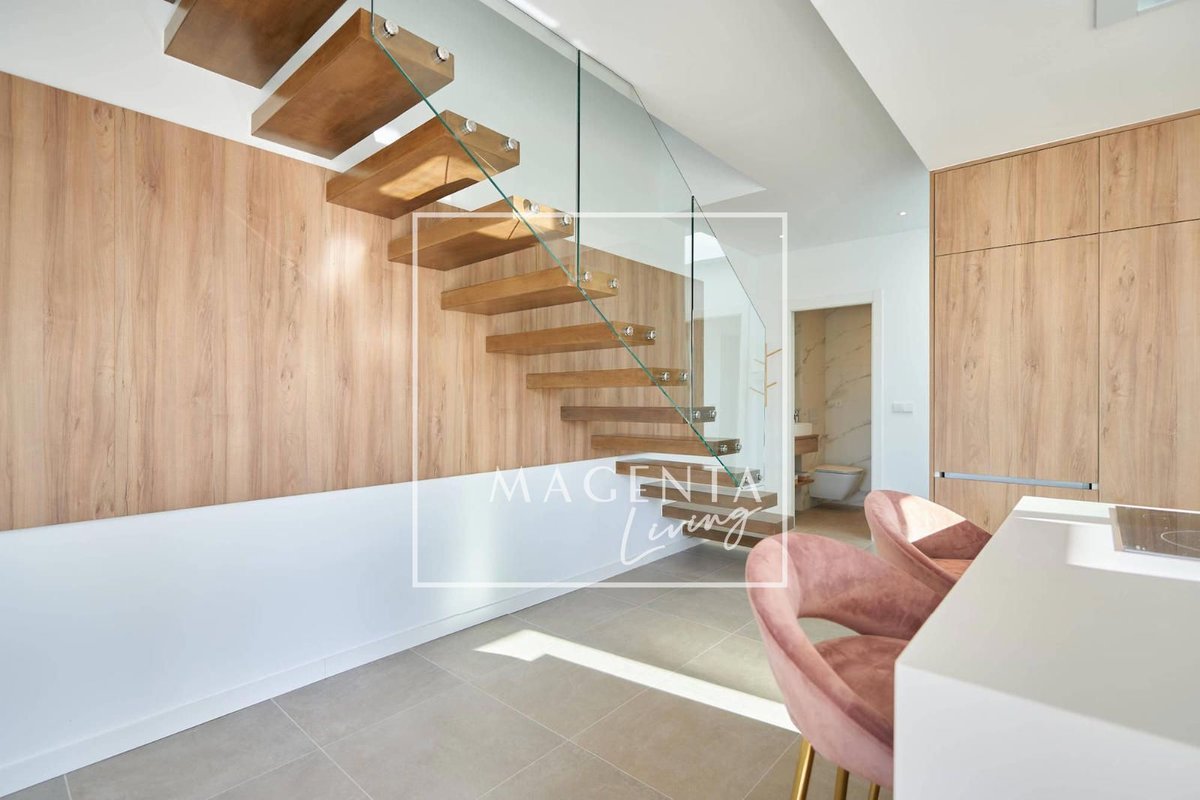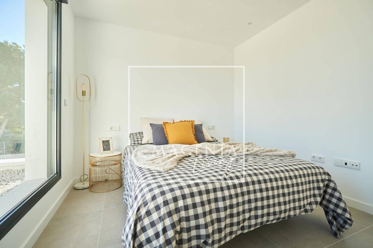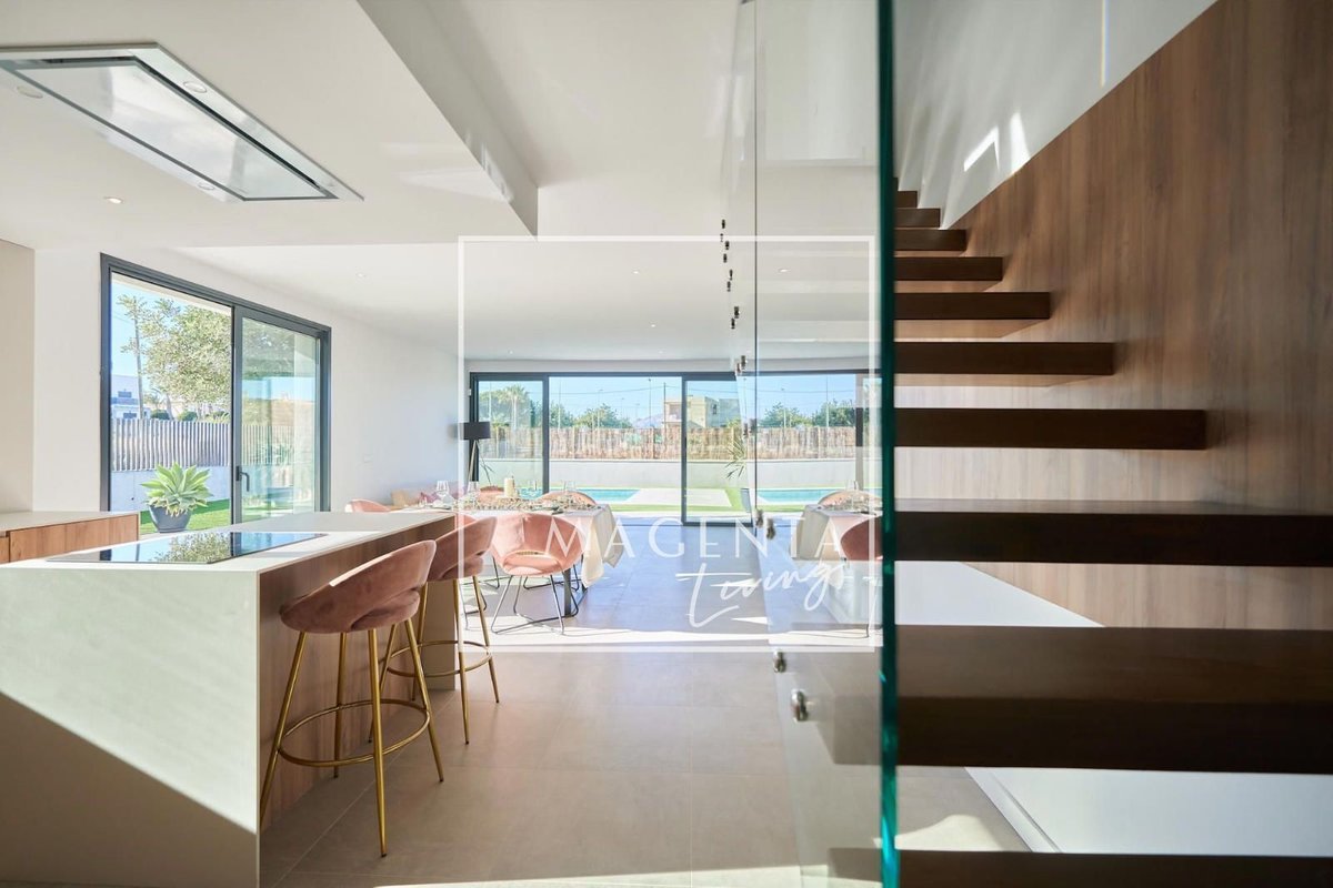 Exclusive detached villa with contemporary design, located in a private residential complex of only 21 homes in the prestigious area of La Font (El Campello). Its excellent location offers residential tranquillity just 2 km from Muchavista Beach, with convenient access to San Juan Playa, San Juan Pueblo and Alicante city centre.Set on a 355 m² plot, the property stands out for its modern architectural design, double-height entrance and a layout planned to maximise natural light and open spaces.On the main floor, the home features a fully equipped open-concept kitchen that blends seamlessly with a spacious living-dining room. Large glass doors lead to a generous terrace that opens onto an ample garden and a private pool, creating an ideal setting for relaxation. This floor also includes a guest toilet.The upper floor houses three bedrooms. The main bedroom, measuring 17 m², includes an en-suite bathroom, built-in wardrobes and a private 6 m² open terrace with clear views of the garden and pool. The two additional bedrooms, each over 9 m², also include built-in wardrobes and share a modern full bathroom.The 34 m² basement offers an open-plan space, a full bathroom and a practical English patio that provides natural light and ventilation, making it an ideal multifunctional area.This home boasts an A energy rating thanks to its individual aerothermal system for hot water, ducted air conditioning (hot/cold), LED lighting, solar panels and pre-installation for an electric vehicle charging point. It also includes two private parking spaces within the plot.La Font is one of the most desirable areas around Alicante due to its proximity to the sea, excellent range of services, international schools and leisure areas—combining comfort and exclusivity in a peaceful, well-connected environment.A modern, bright and energy-efficient home, perfect for those seeking quality, design and a privileged location.Contact us and discover this magnificent villa in La Font, El Campello.