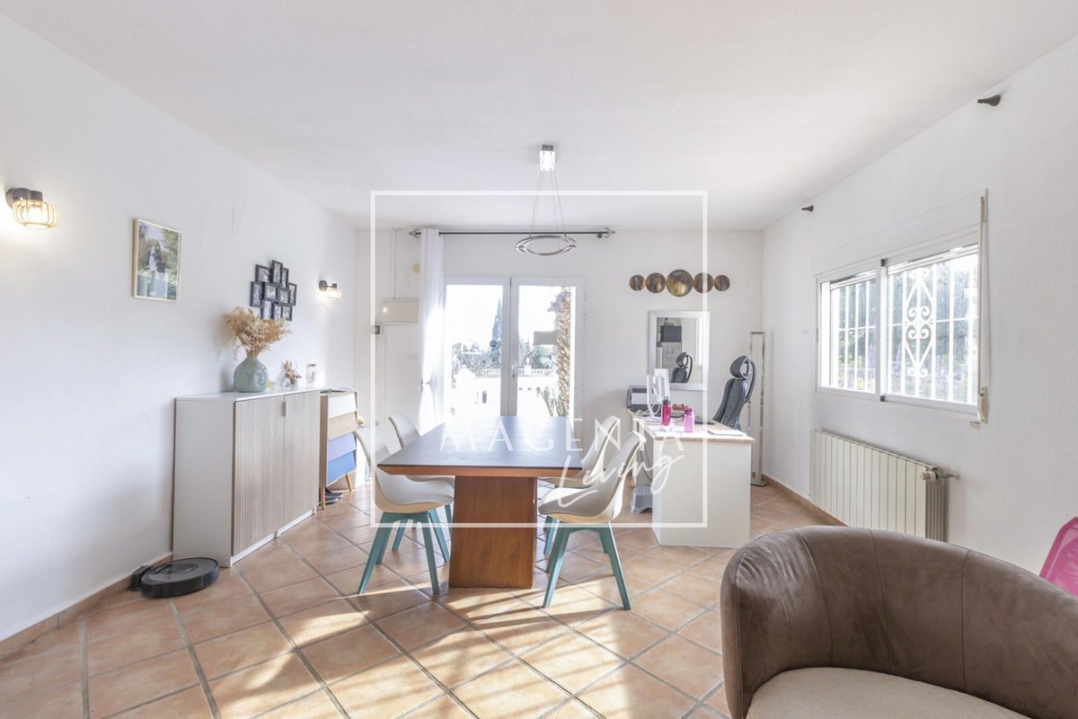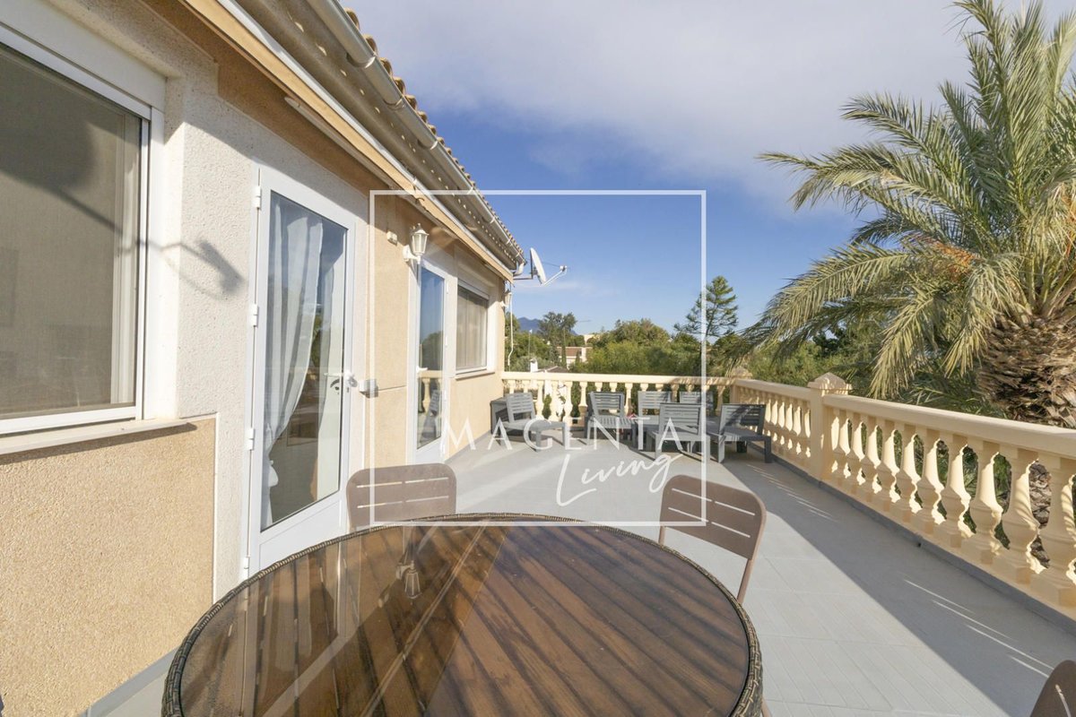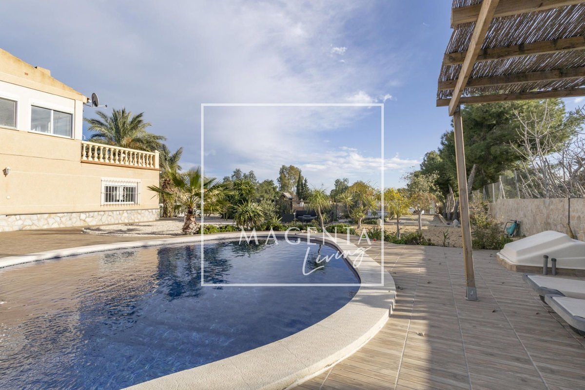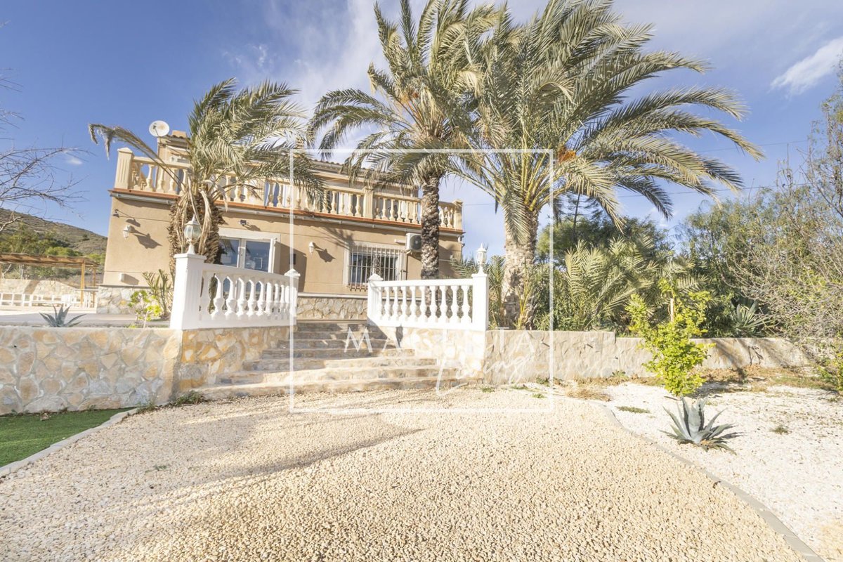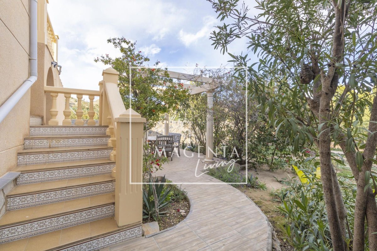 Can you imagine living surrounded by nature, with open views of the mountains and the sea, in a peaceful setting just minutes from the city? Discover this charming detached villa in Valle del Sol, where comfort and scenery come together to offer you a privileged lifestyle.The villa sits on a generous 1,926 m² plot, where the garden and spacious grounds provide multiple outdoor areas to enjoy.On the ground floor, approximately 170 m², we find a large and very bright living-dining room overlooking the garden, ideal for enjoying family moments. To one side, there is a master bedroom with an en-suite bathroom, also with views of the garden and entrance. Three additional bedrooms and a full bathroom complete the sleeping area. The independent kitchen, fully equipped and practically laid out, has direct access to a porch with a gallery.The second floor houses an attractive independent 60 m² space that functions as a home in itself, perfect for guests or as additional private space. This level features a double bedroom, a full bathroom with a bathtub, and a cheerful open-plan kitchen connected to the living-dining area, all very bright and with spectacular views of the surrounding countryside. From the living room, there is access to a magnificent terrace — a privileged spot from which to admire views of the large garden, pool area, mountains, and the sea on the horizon.The exterior is undoubtedly one of the main highlights of this property. The extensive garden surrounding the home offers various charming corners, perfect for relaxing and enjoying the Mediterranean climate all year round. There is a barbecue area, a lovely outdoor dining space with a pergola surrounded by fruit trees and flowers, a chill-out area, a children’s zone, and multiple landscaped areas with plants.For maintenance, the plot features an underground automatic irrigation system, making it easy to care for the green areas. In addition, there is a water tank in the garden with a hatch and pump, providing an additional backup water resource if needed.The property is connected to both the electricity and water mains, ensuring comfort and continuous supply in everyday life.Two enclosed garage spaces, providing security and convenience, complete the exterior area of the house.Valle del Sol combines the serenity of living close to nature with ample outdoor space, along with the convenience of having the city nearby. Located just 10 minutes from Mutxamel and about 25 minutes from Alicante city center, this area offers quick access to services, shops, golf courses, leisure activities, and beaches. Its excellent motorway connection to Elche–Alicante International Airport makes both national and international travel easy, making it a strategic location for those who value comfort and the Mediterranean lifestyle.A villa designed to be enjoyed without rush, where every space invites you to experience the Mediterranean with calm, openness, and privacy.IBI : 785,28€At Magenta Living, we will be delighted to show you this home. Contact us!