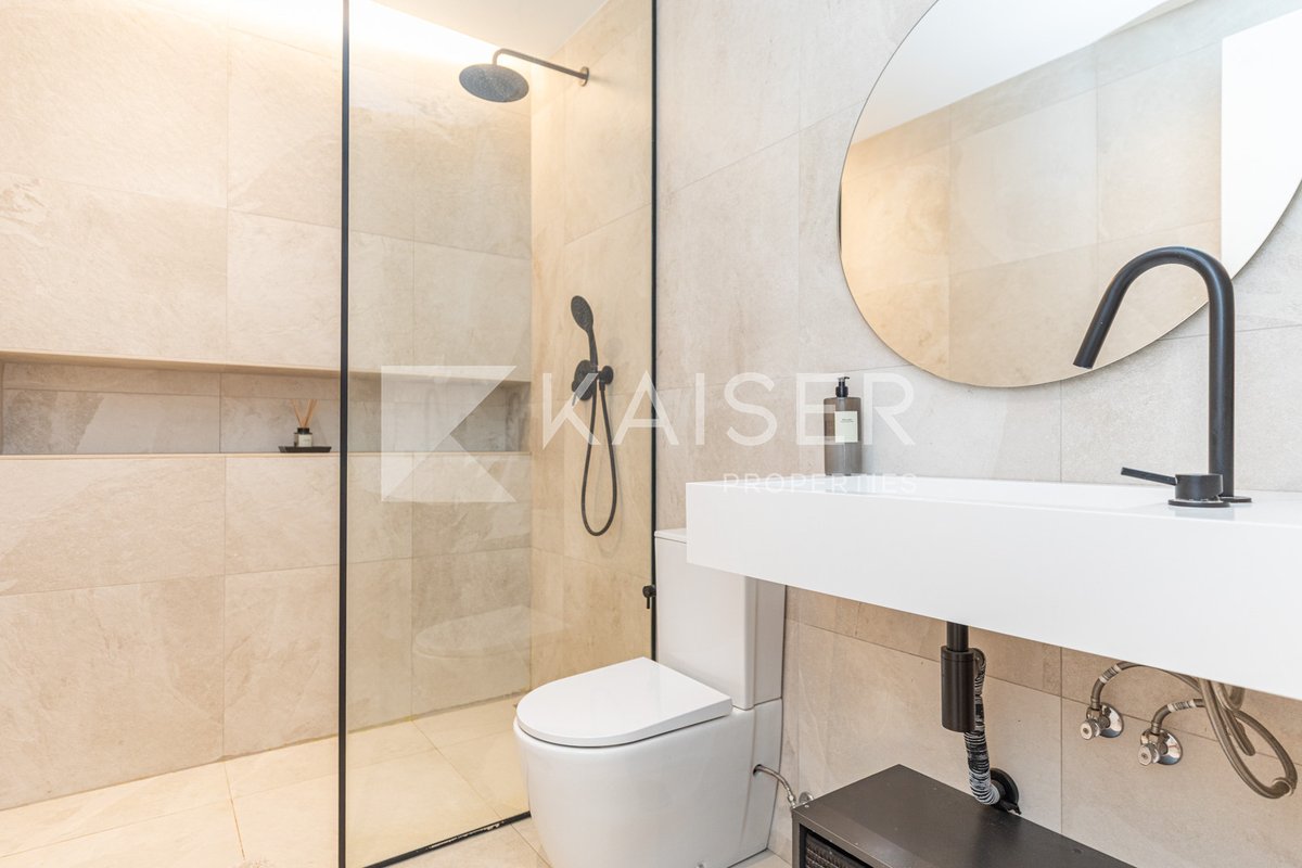 Ground floor: Entrance hall, spacious and well-lit living and dining room with sliding doors to the pool area, fitted kitchen with access door to the back patio, one bedroom, one bathroom, a walk-in wardrobe and a pantry/storage.