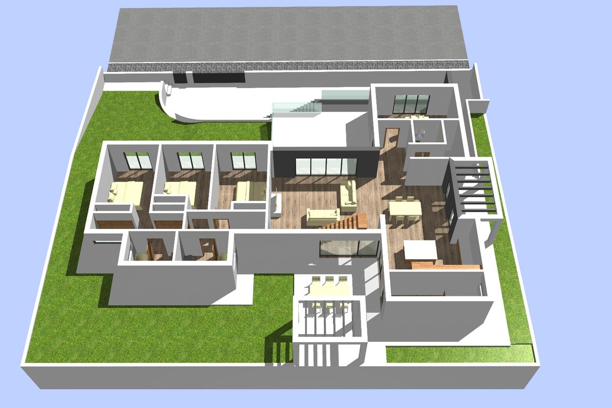 - Rez-de-chaussée : garage de 195 m² et terrasse de 53 m² — un espace polyvalent pour parking, stockage, réceptions et loisirs