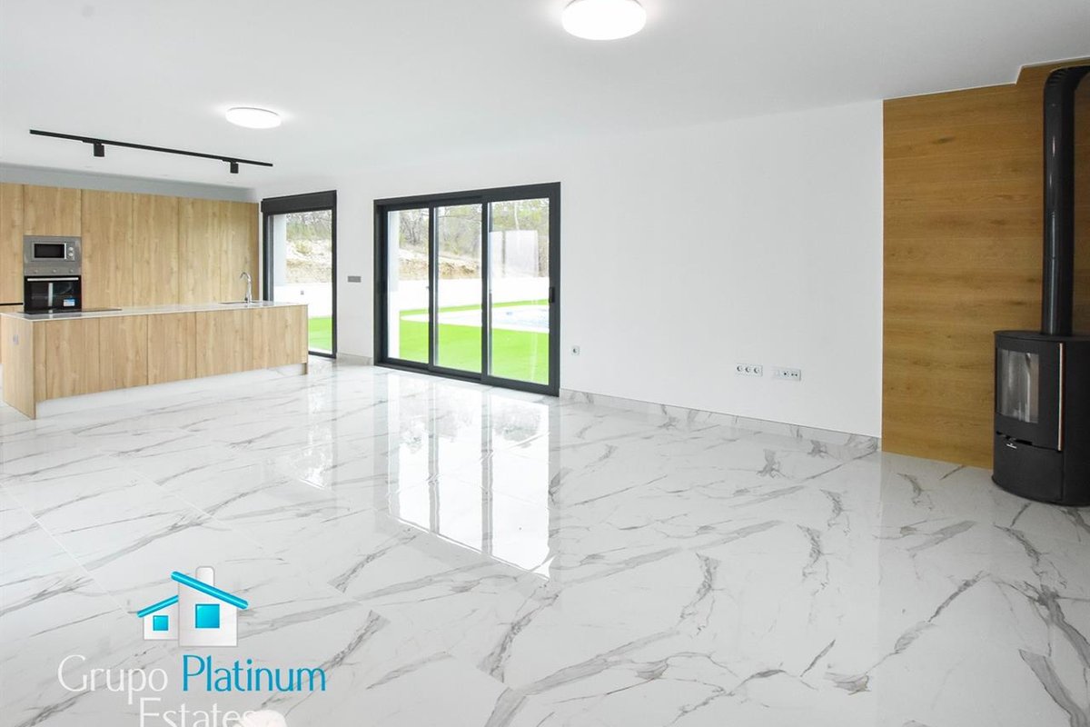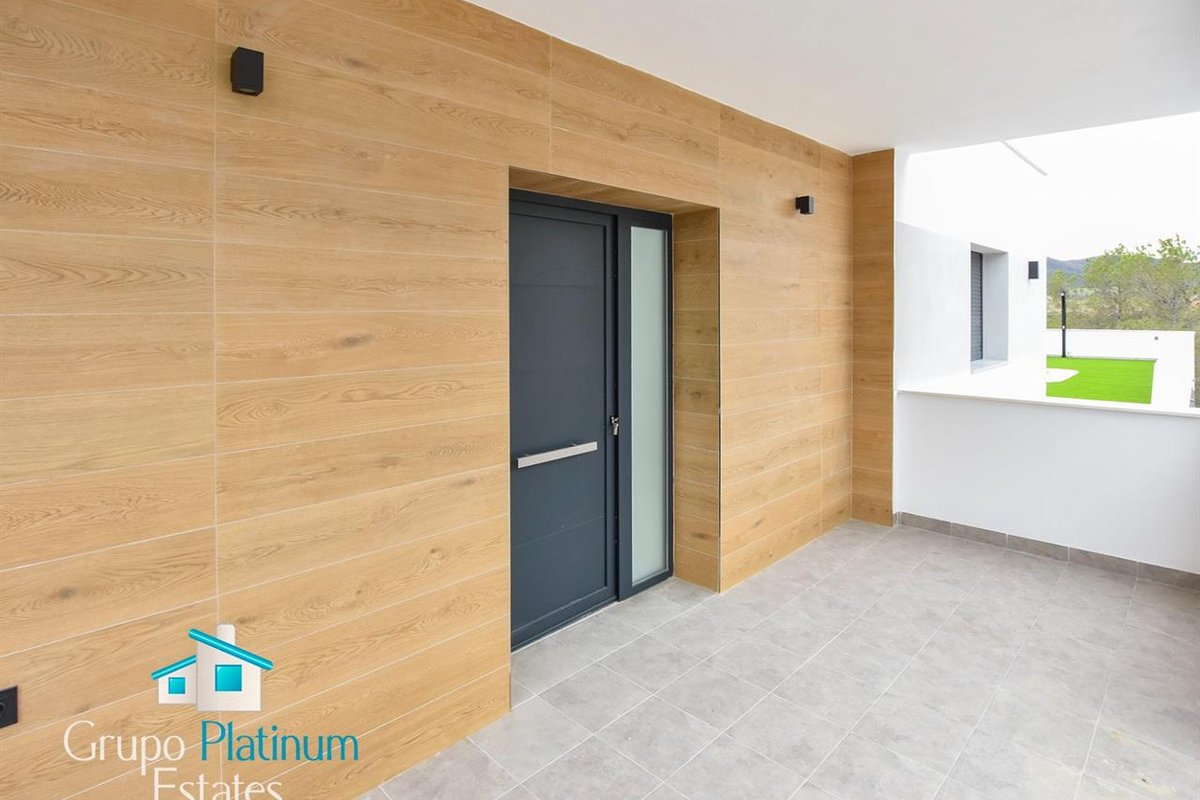 Inside, the property has a hallway, a spacious livingdining room and a fully equipped kitchen with a utility room. The porcelain floors and the interior doors in light wood or white add elegance, while the grey aluminium windows guarantee light and insulation.