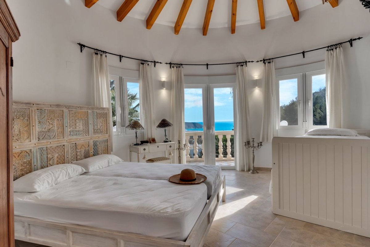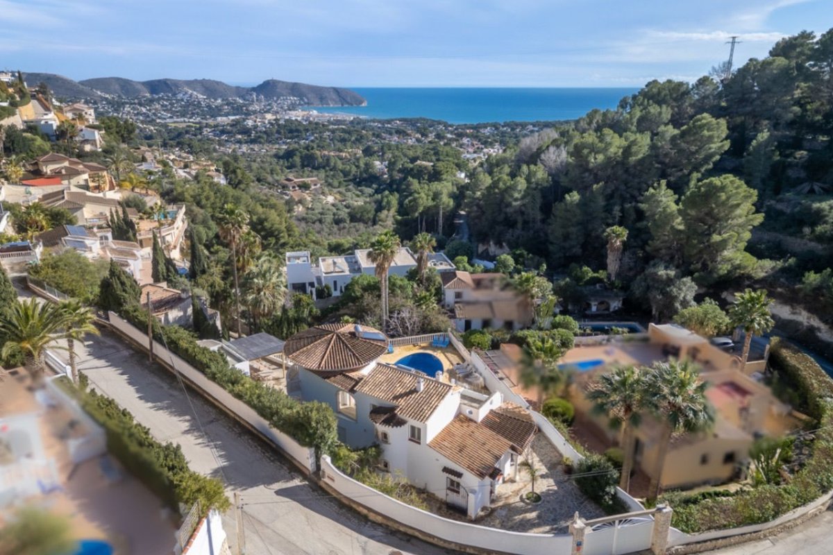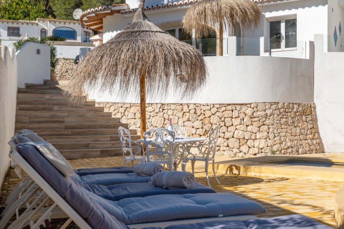 Unique villa for sale with five bedrooms, sea view, and a good sun orientation in Benimeit, MorairaWe are proud to present to you this exclusive villa located in the beloved Benimeit in Moraira. A quiet, sunny location, yet only a short drive away from all amenities, the center, and the beaches.You enter the property through a large electric gate granting access to a spacious parking area. From here, you reach the house entirely on one level, without stairs – a particularly comfortable bonus!Upon entering, you are greeted by a cozy, bright living room with a wood stove and an open, fully renovated kitchen finished in stylish microcement. All appliances are included and the fixed microcement dining table, seamlessly connected to the kitchen, invites you to enjoy long, cozy dinners. On this level, there are also two charming bedrooms sharing a beautifully renovated bathroom, also in microcement, equipped with a bathtub and double sink.Through an indoor staircase, you access the upper floor, which can also be completely closed off, or you can have access from outside. Here you will find a third, very spacious bedroom with a new ensuite bathroom and a generous private balcony with breathtaking views over the sea and the center of Moraira.Adjacent, through an open corridor connecting bedroom three and four, you reach the next bedroom – also known as the “tower room.” A truly unique space with high ceilings, typical Spanish wooden beams, a renovated ensuite bathroom and once again a balcony with spectacular sea views.Last but not least is the fifth bedroom on the ground floor, with separate outdoor access, a four-poster bed, and an ensuite bathroom in microcement. From this room, you can access the beautifully landscaped terrace with stylish umbrellas and a fully equipped, covered outdoor kitchen – the perfect spot to enjoy shade, coziness, and long dinners during the warm summer days. When it gets dark, you can go a level higher: on the roof terrace above the outdoor kitchen, you can savor the lights of the surroundings and the magical atmosphere with a glass of wine!Down a staircase, you reach the pool area. The large pool has an atypical shape – can you guess what it is? – and is surrounded by spacious terraces for sunbathing. There are two storage rooms and a beautiful outdoor shower made of natural stone that complete the picture.The property is equipped with air conditioning for cooling and heating, solar boiler, double glazing (partially with shutters), has an excellent sun orientation, and enjoys complete privacy. Moreover, the villa is currently very well rented, making this villa particularly interesting as an investment.Key features:Sea viewGood orientationFive bedrooms and four bathrooms (3 ensuite)Fully equipped, covered outdoor kitchenNo overlooking neighborsCurrently well rented - interesting as an investmentDouble glazing, renovated bathrooms and kitchen, air conditioningShort driving distance to amenities, the beach, and the centerQuiet location, private, sun almost all day, with an exceptional view: here charm, comfort, and returns come together perfectly.Don’t wait any longer and make your appointment today to discover this unique villa.~