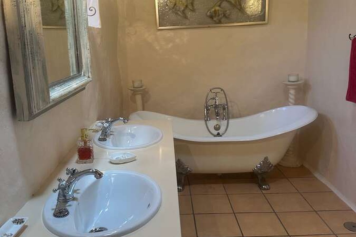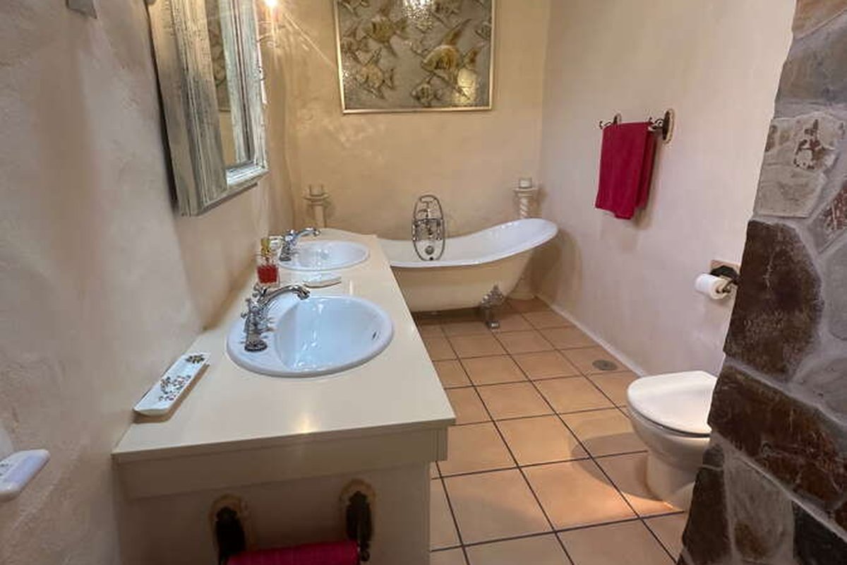 There are 5 bedrooms, 3 with en-suite bathrooms. The master bedroom has a built in wardrobe with an ornate wooden door, vaulted ceilings and a luxurious en-suite bathroom with a bath tub.